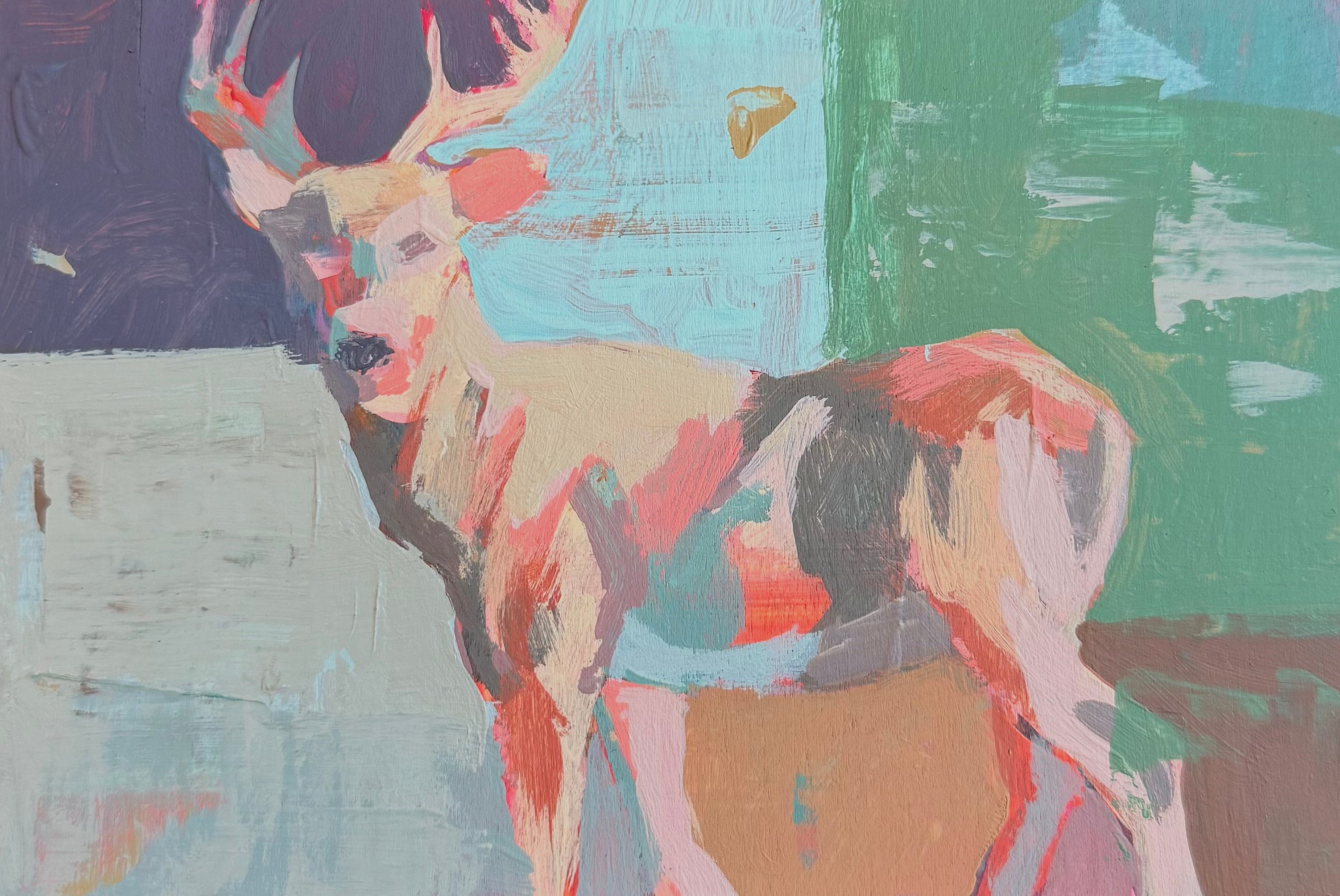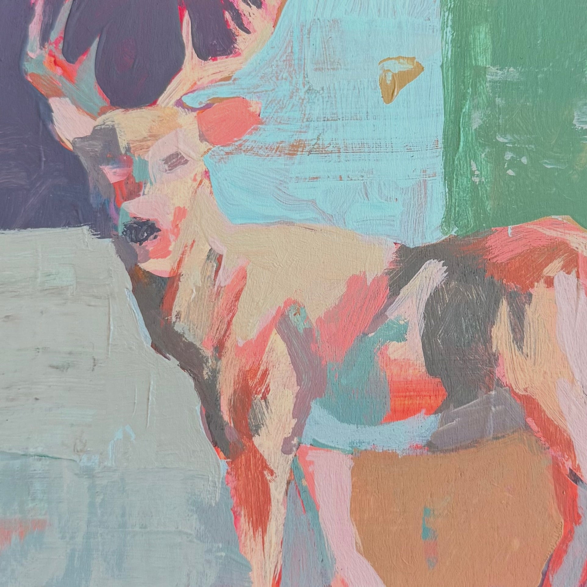 This is an original, acrylic painting on a birchwood panel signed by Teil and framed in a natural, maple floater frame.