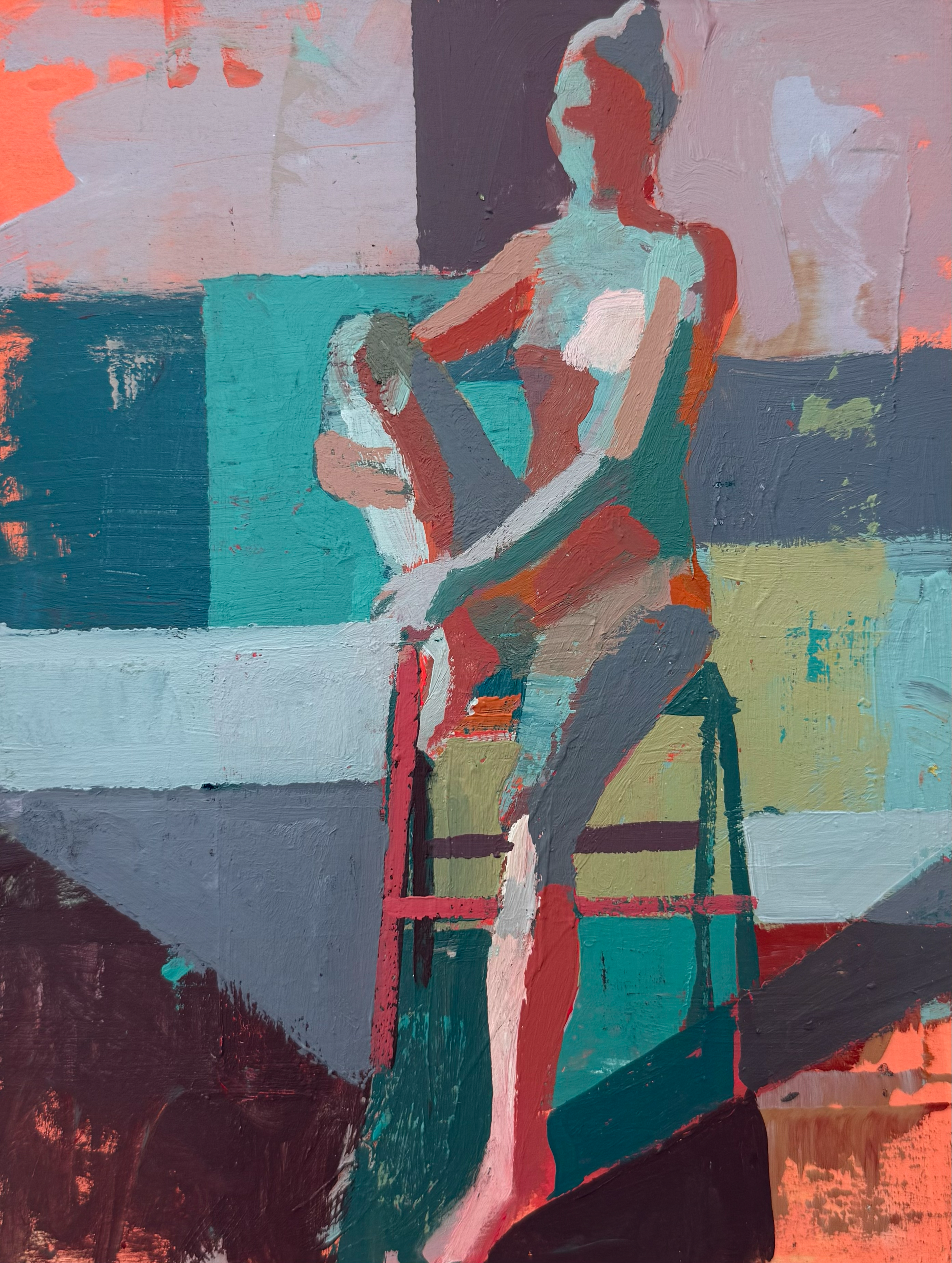 This is an original, acrylic painting on a birchwood panel signed by Teil and framed in a natural, maple floater frame.