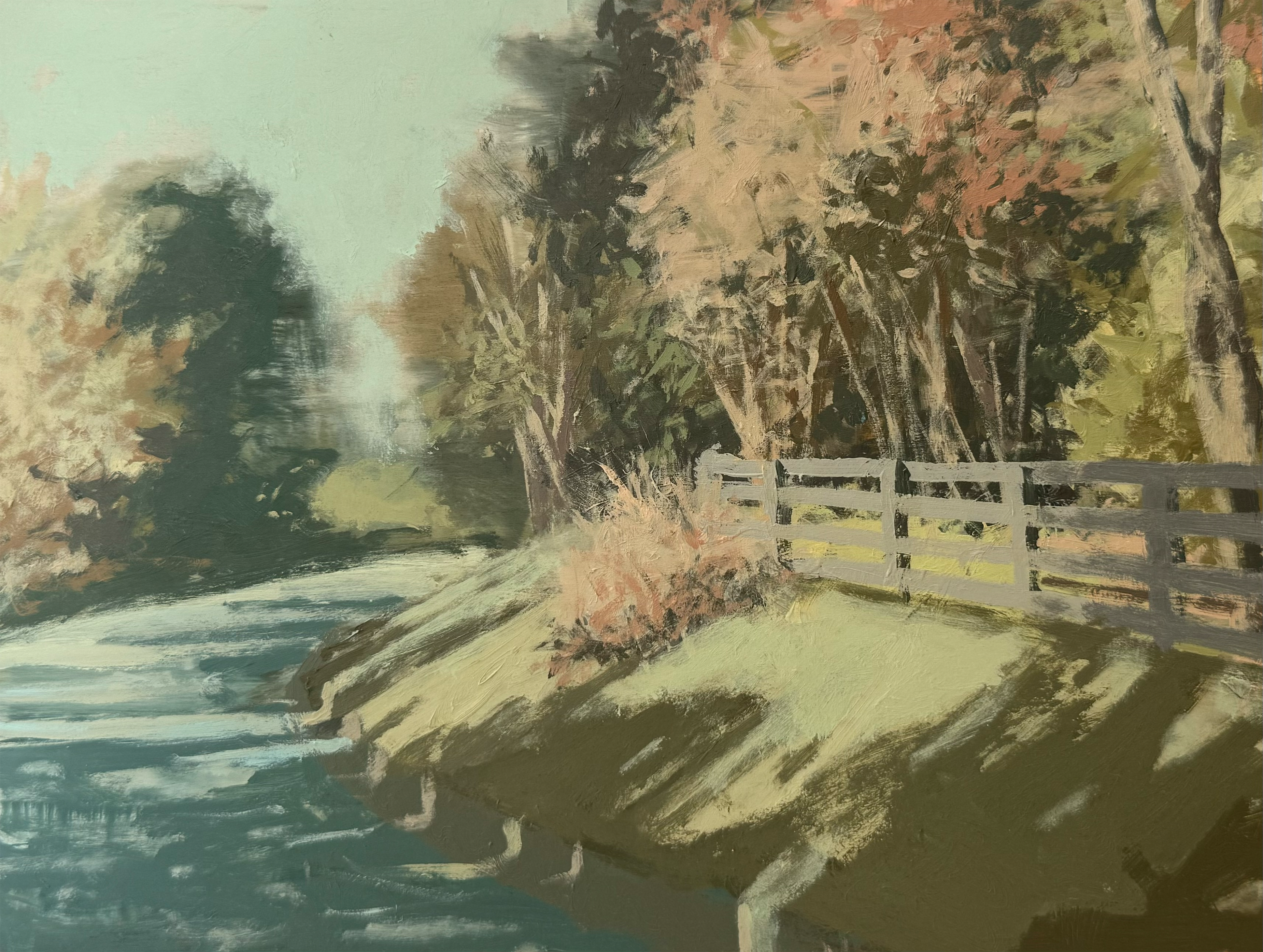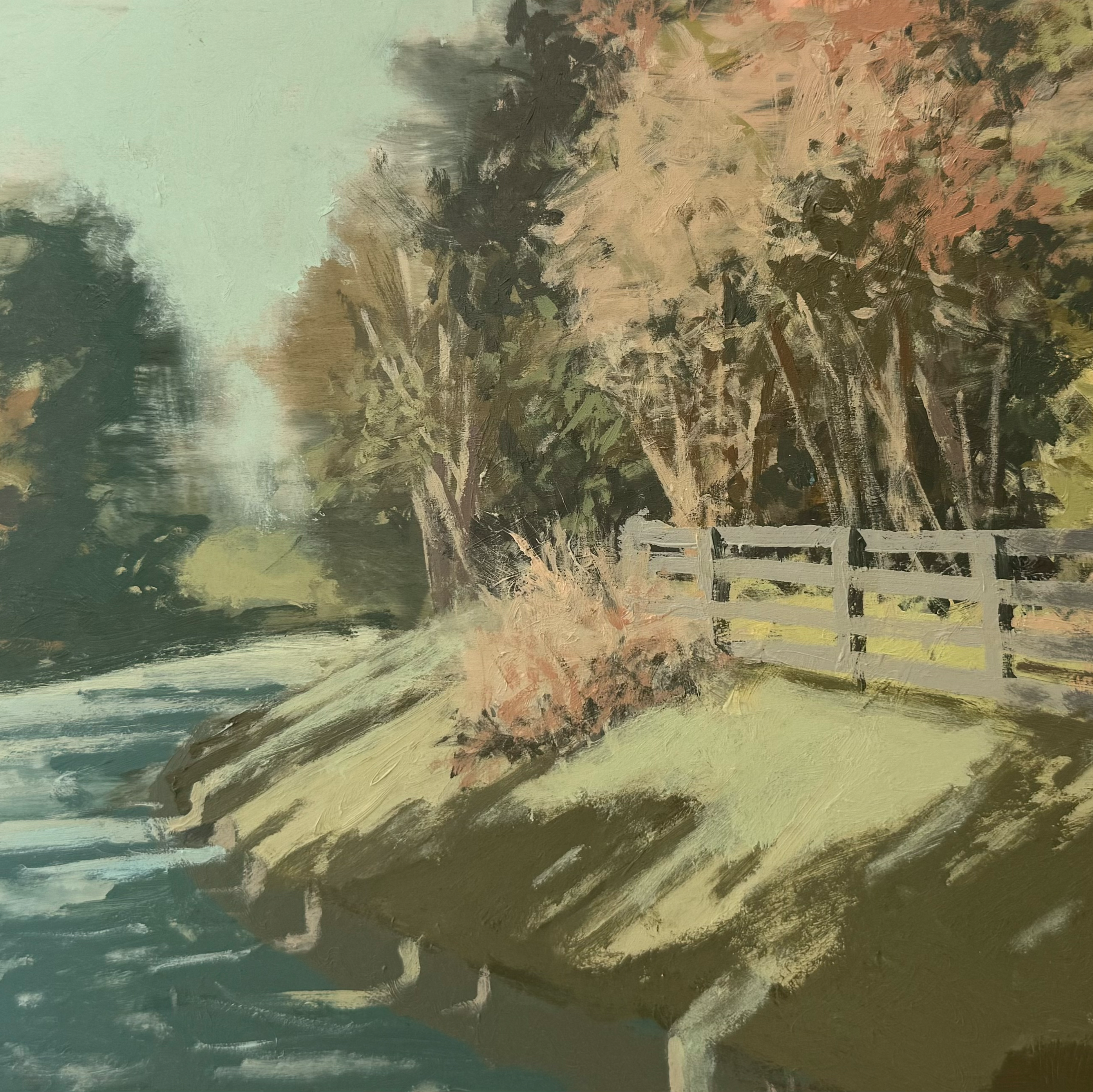 This is an original, acrylic painting on a birchwood panel signed by Teil and framed in a natural, maple floater frame.