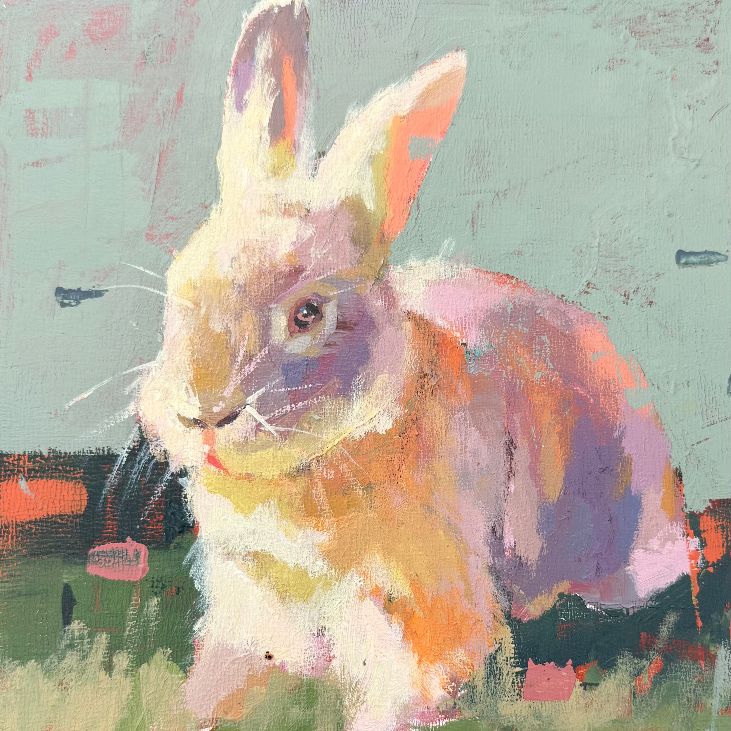 This is an original, acrylic painting on a birchwood panel signed by Teil and framed in a natural, maple floater frame.