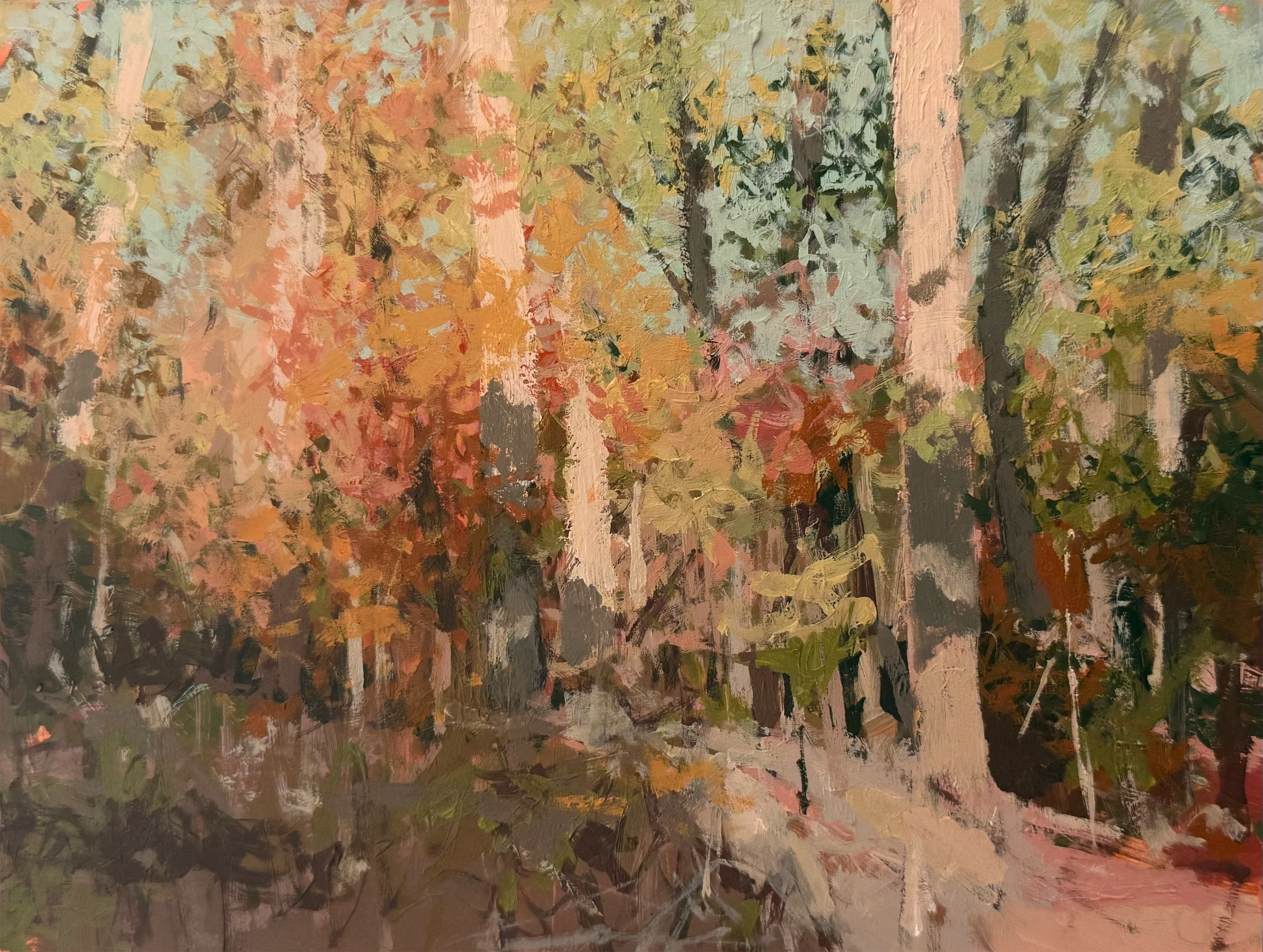 This is an original, acrylic painting on a birchwood panel signed by Teil and framed in a natural, maple floater frame.