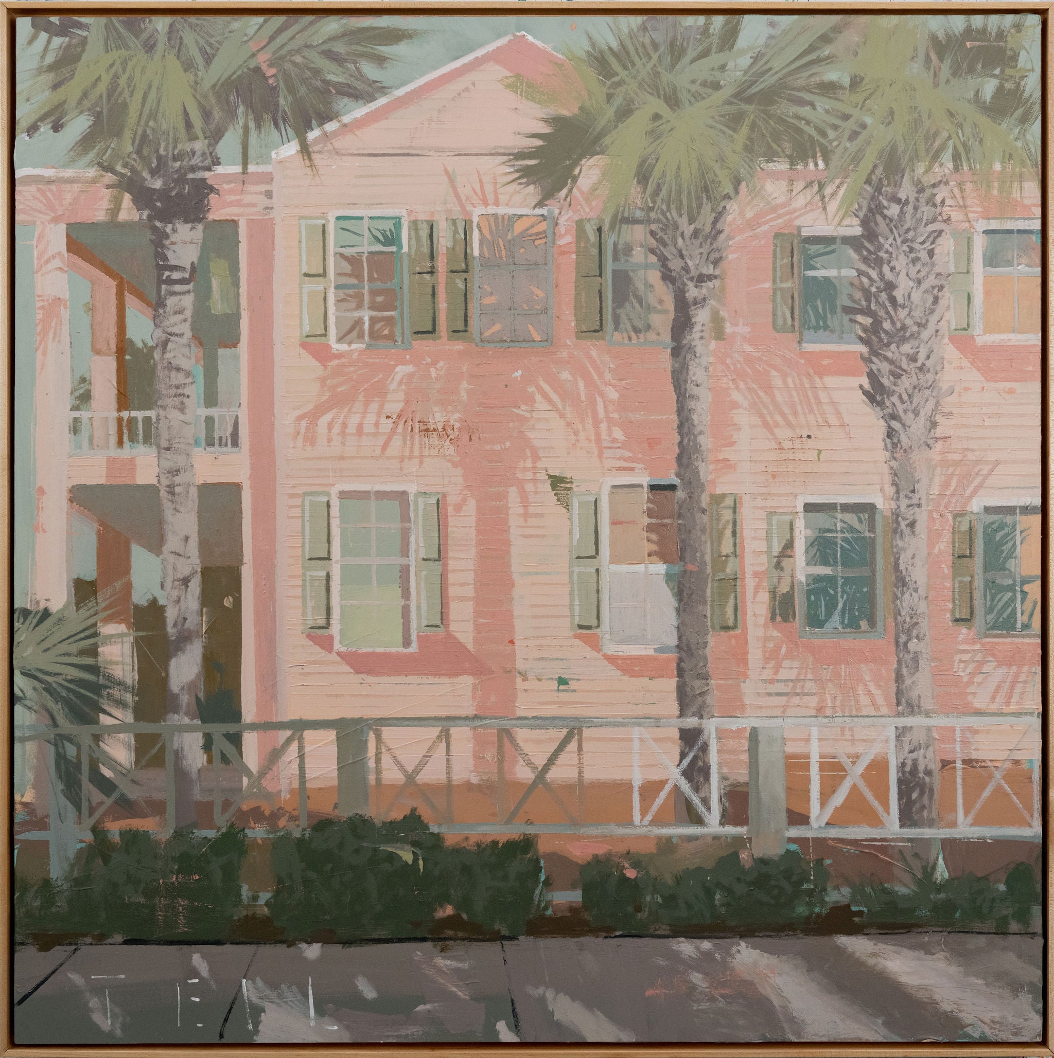 This is an original, acrylic painting on a birchwood panel signed by Teil and framed in a natural, maple floater frame.