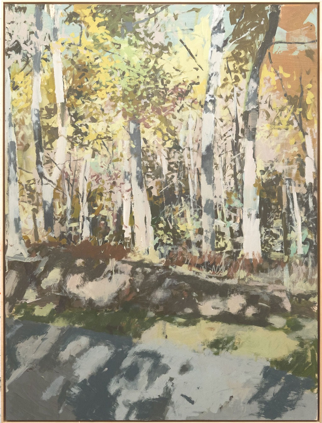 This is an original, acrylic painting on a birchwood panel signed by Teil and framed in a natural, maple floater frame.