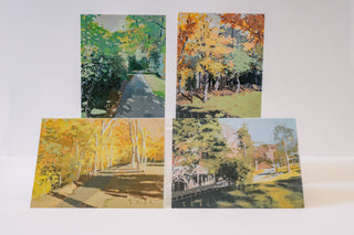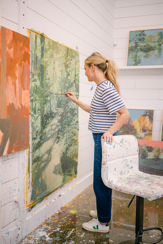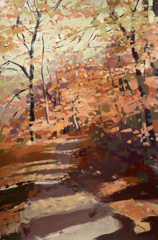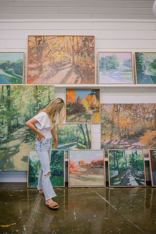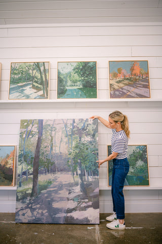 Teil’s love of painting landscapes began in the form of a commissioned forest scene inspired by the Bible verse John 8:12, “I am the light of the world. Whoever follows me will not walk in darkness, but will have light of life.” Since this early iteration of the series, Teil has continued to be called back to the subject in an effort to continue to play with color combinations and perspective. As a subject matter that calls great viewer attention to the contrast of darkness and light, Teil enjoys revisiting landscapes often.