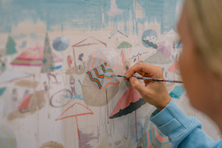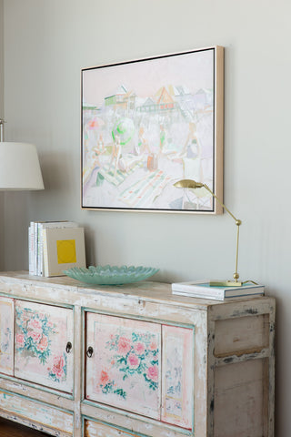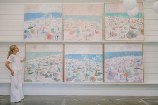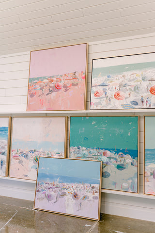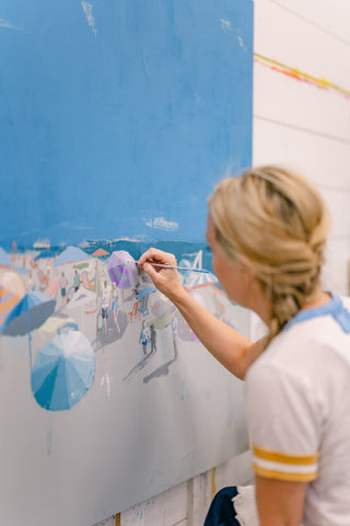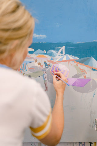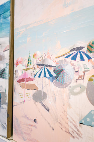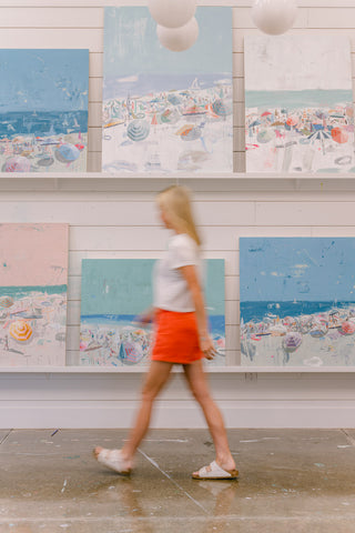 Teil’s beach scenes originated as a subject focus when she was living in Charleston. The city that kick-started her fine art career, Teil was endlessly inspired by the changing scenes, people, color and light that could be seen across Charleston’s beaches. Dissecting the elements of beach scenes experienced in real life gaveTeil so much creative energy: the patterns in bathing suits, the vast open sky juxtaposed with the tightly positioned crowds, umbrellas dancing in the breeze casting shadow and reflecting light… the depth of visual material wooed Teil and inspired her to create one of her most popular subjects on canvas. Since painting her first beaches in 2013, she has continued to push and pull the series by bringing the view closer or farther in composition, narrowing or expanding the scale of the composition and playing with perspective.