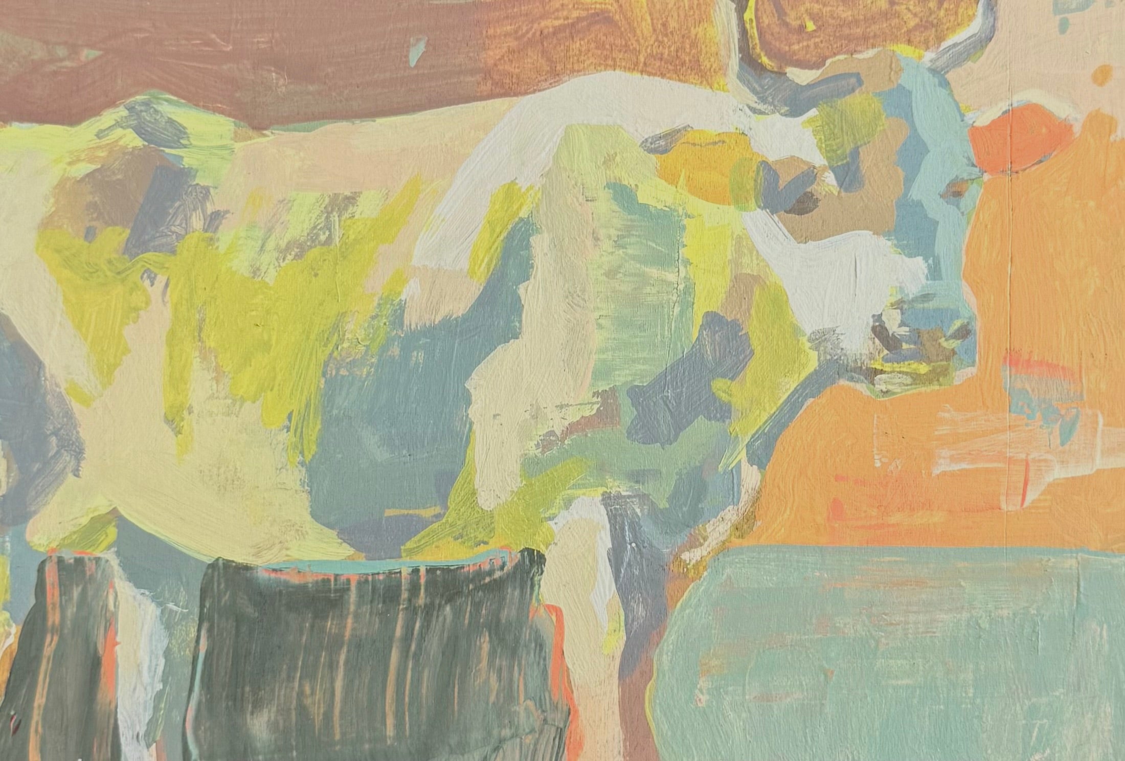 This is an original, acrylic painting on a birchwood panel signed by Teil and framed in a natural, maple floater frame.